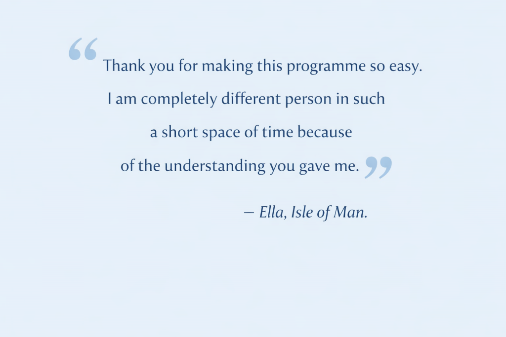 My 6-week, 1-to-1, Mind Mastery Programme is designed for people who want more than an introduction. It offers personalised guidance, deeper practices, and structured support to help you create real and lasting change, from the inside out.
